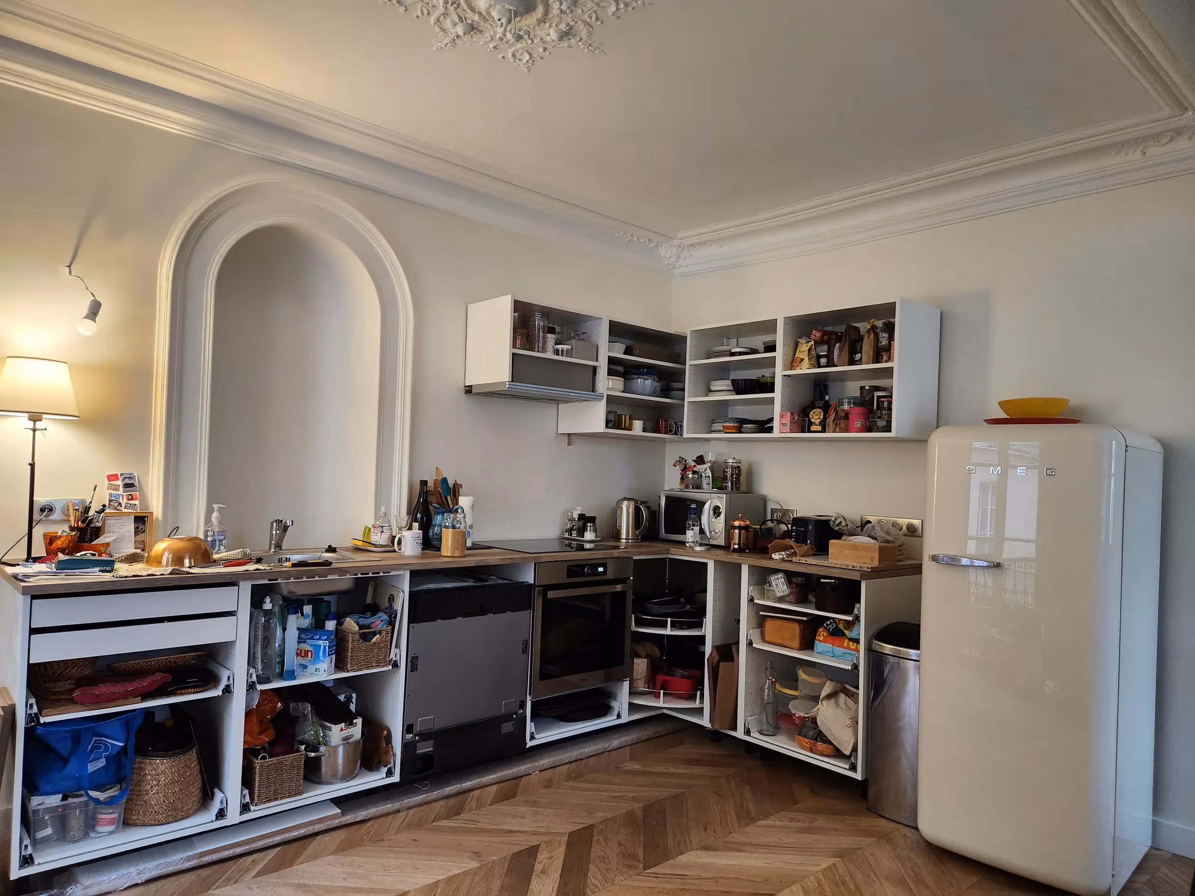 On centre rapidement la proposition sur le Camel Ultra-mat, une sorte d’or poudré dont la couleur s’intensifie sous l’effet de la lumière naturelle, pour le petit bloc d’éléments hauts toujours à hauteur d'œil (et plinthes pour rappel). Les éléments bas sont eux choisis en Effet Bois Noyer Moyen Ombré qui séduit autant par le contraste entre son âme brune et son veinage clair que par son toucher “brut de scie” si spécifique.