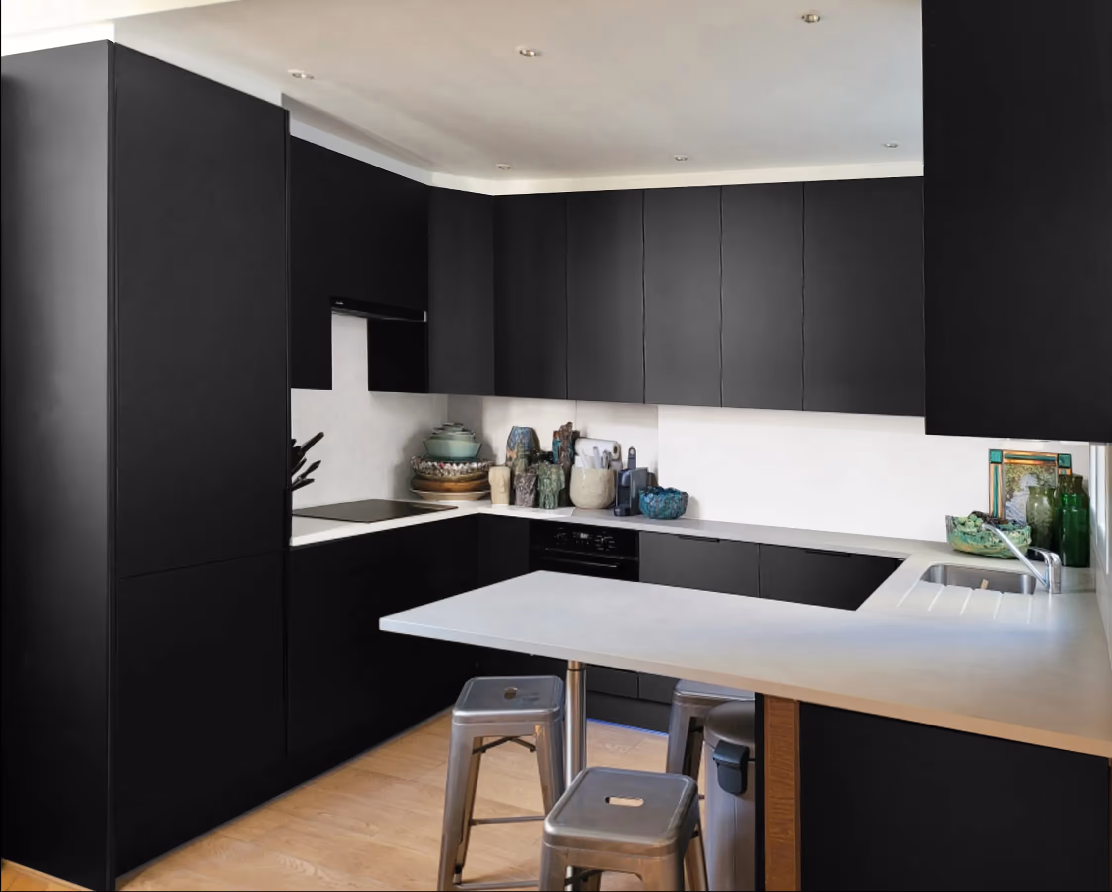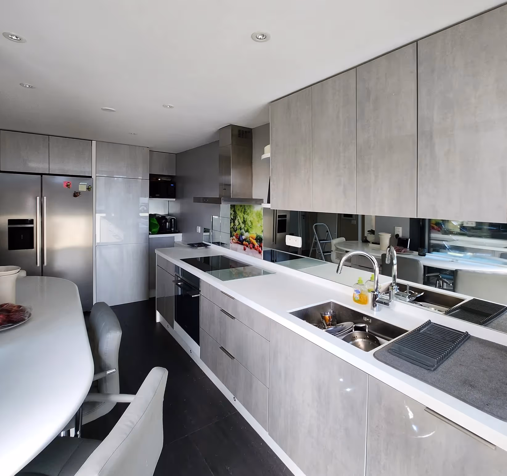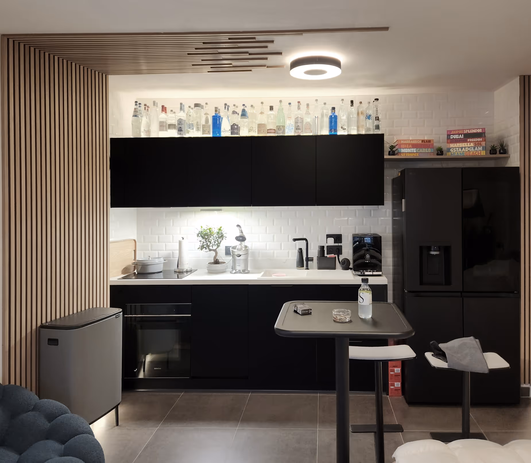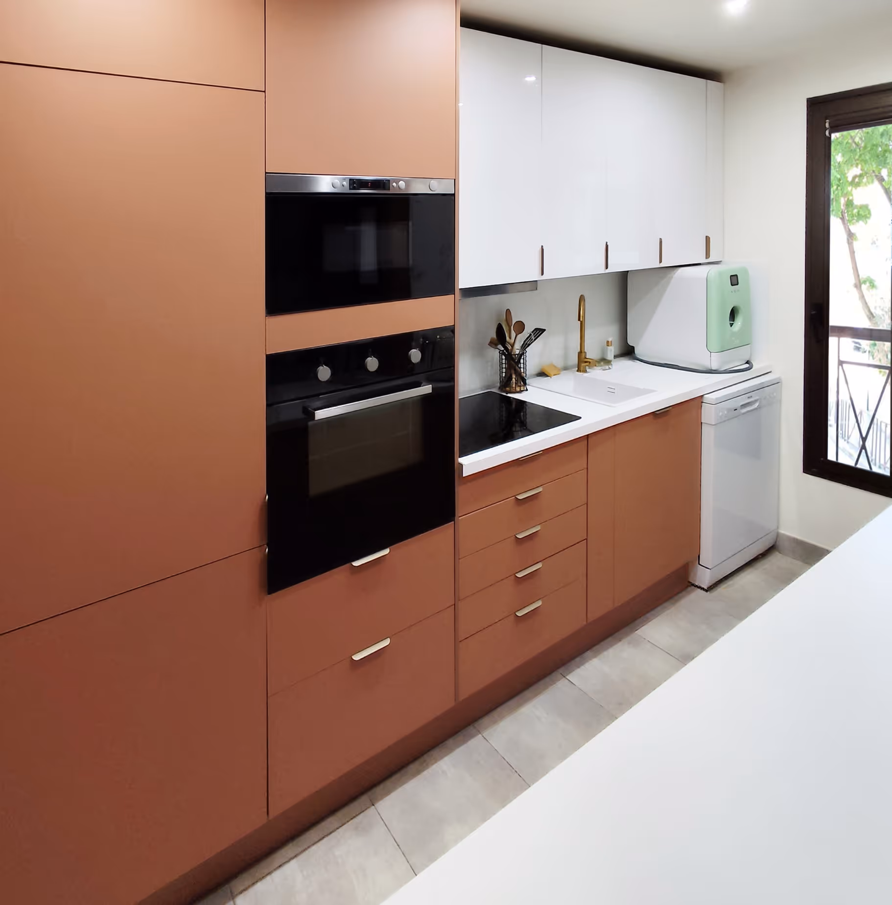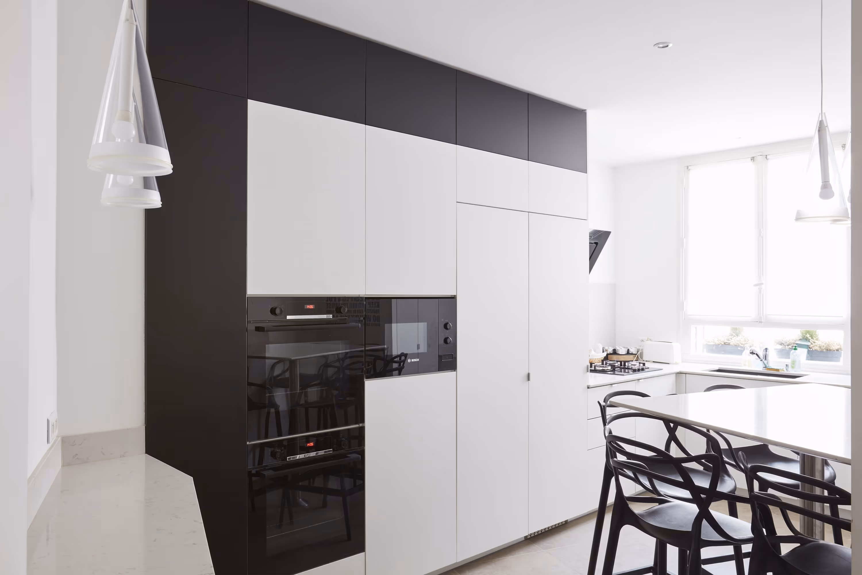 Ils optent pour notre concept et leur choix de matière se porte sur le plaquage noyer d’ébénisterie. La cuisine n’étant pas très large, nous leur proposons une solution bicolore afin d’éviter que le tout devienne trop sombre. Choisir du blanc pailleté Ultra-brillant pour les façades des éléments hauts permet d’alléger l’ensemble, tout en renvoyant mieux la lumière et donc créer plus de profondeur.