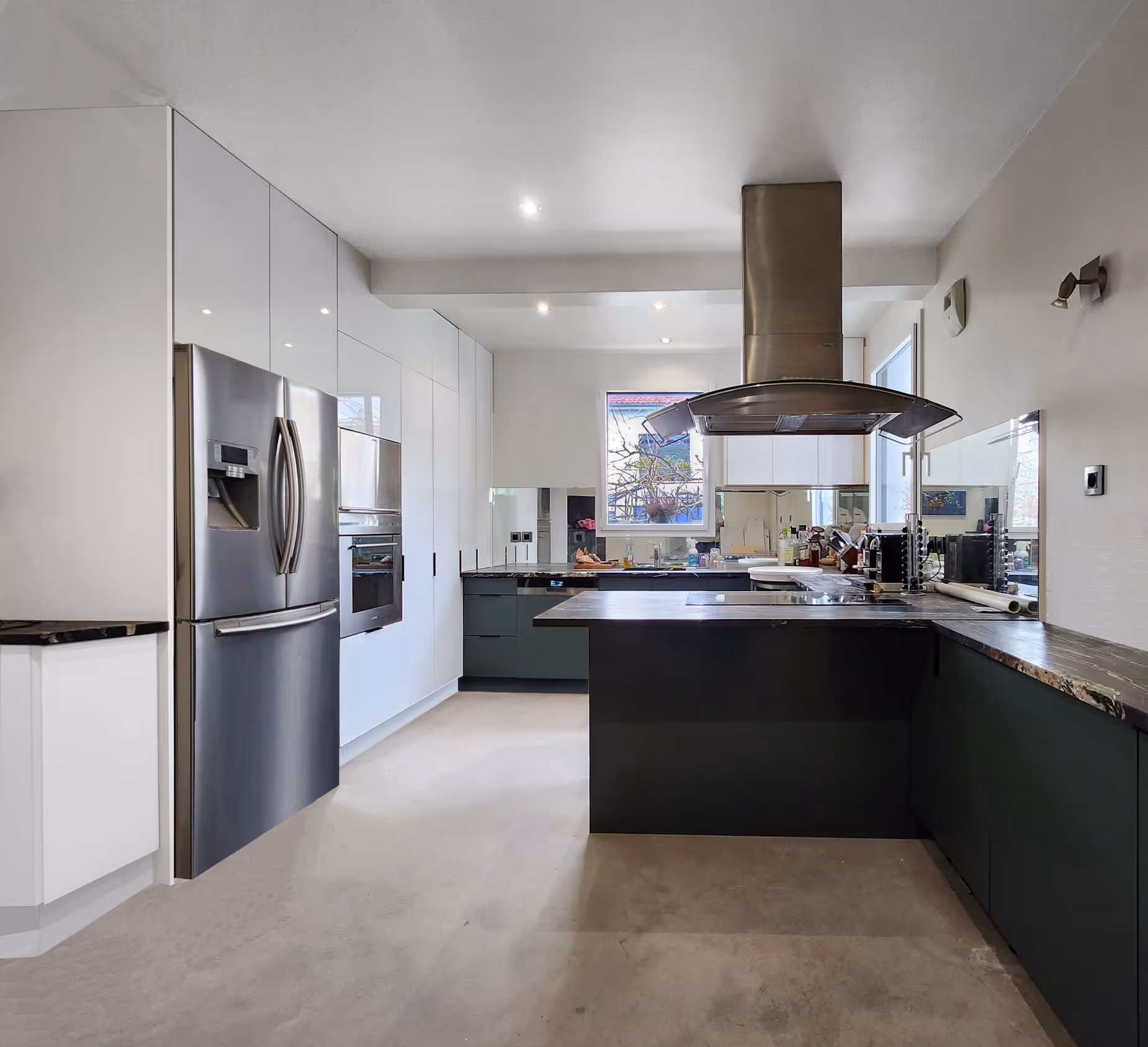 La cuisine rouge, pourtant bien agencée avec un authentique sol en pierre, ne leur convient pas du tout. Ouverte en bout vers un salon au parquet magnifique, l’ensemble les choque, et ils souhaitent harmoniser ces espaces.
